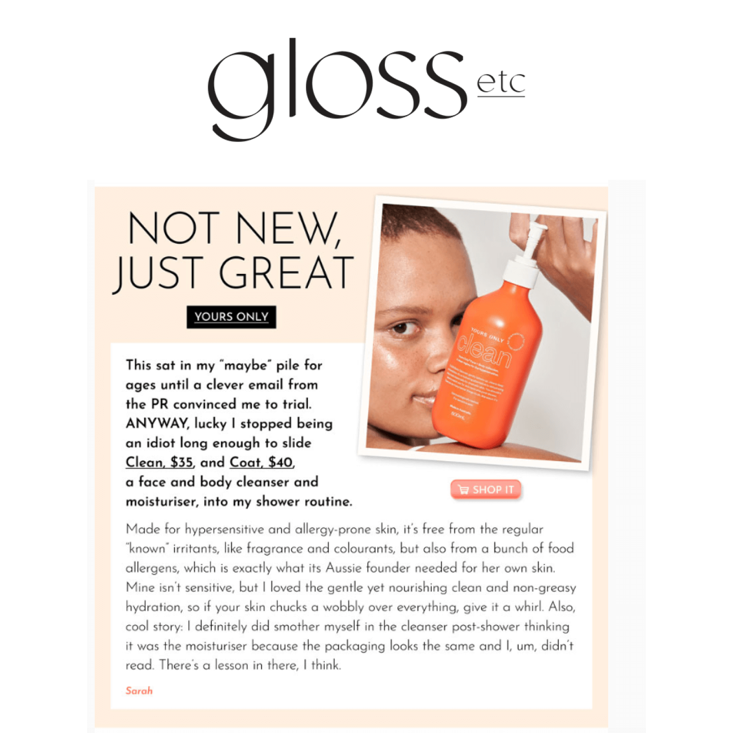 "A game-changing brand crafted with ingredients to nourish and protect sensitive skin. Yours Only has transformed my routine and looks cute in my bathroom!"
